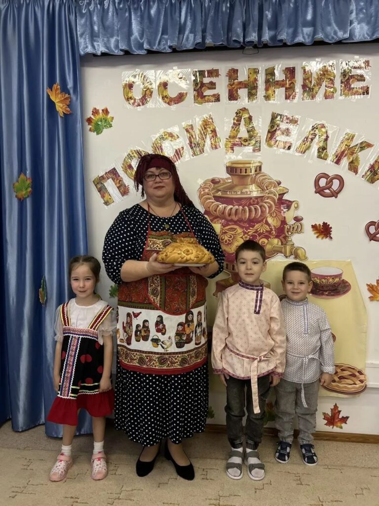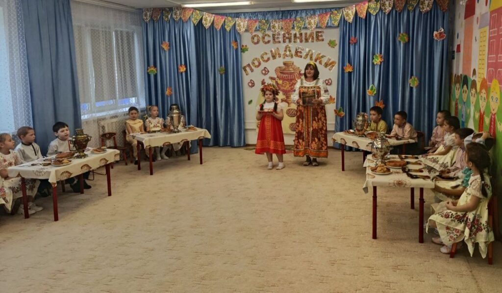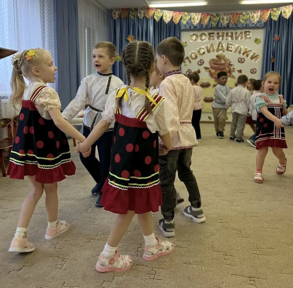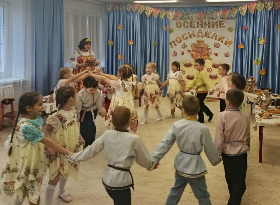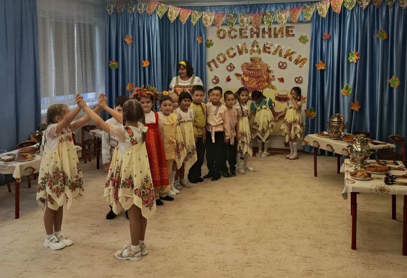 С целью формирования духовно- нравственных качеств и патриотизма дошкольников, ознакомления с русской народной культурой, традициями и обычаями родной страны в старших группах детского сада были проведены «Осенние посиделки». При подготовке к мероприятию ребята познакомились с традициями посиделок в старину, с особенностями русского народного костюма, быта, традиционными ремеслами, народными играми, хороводами. Поэтому встречая красавицу Осень, дети показали весь колорит народного быта и широту души русского народа.